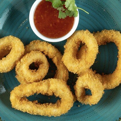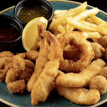 Королевские креветки обжаренные в кляре во фритюре. Подаются с соусом "Гадкий Чили"
