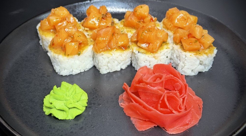 Кубики охлажденного лосося в сладковатом соусе, на подушке из гуакамоле, выложенном на ролле с огурцом и манго.